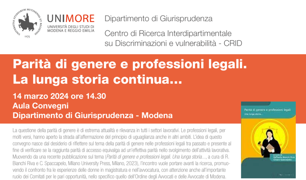 Giovedì 14 marzo 2024 dalle ore 15.00 alle 18.00 presso il Dipartimento di Giurisprudenza, Unimore, Via San Geminiano 3, Aula Convegni si terrà il convegno “PARITÀ DI GENERE E PROFESSIONI LEGALI. LA LUNGA STORIA CONTINUA…” promosso dal CRID – Centro di Ricerca Interdipartimentale su Discriminazioni e vulnerabilità in collaborazione con CPO del CUP. Per il […]