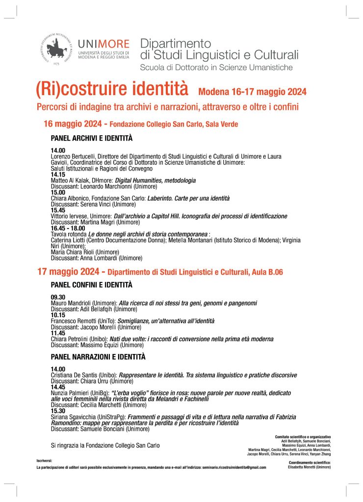 Giovedì 16 maggio 2024 dalle 14.00 presso la Sala Verde – Fondazione Collegio San Carlo di Modena e venerdì 17 maggio 2024 dalle 9.30 presso il Dipartimento Studi Linguistici e Culturali di Unimore (Aula B.06) si terrà il seminario (Ri)costruire identità. Percorsi di indagine tra archivi e narrazioni, attraverso e oltre i confini. L’indagine sulla […]