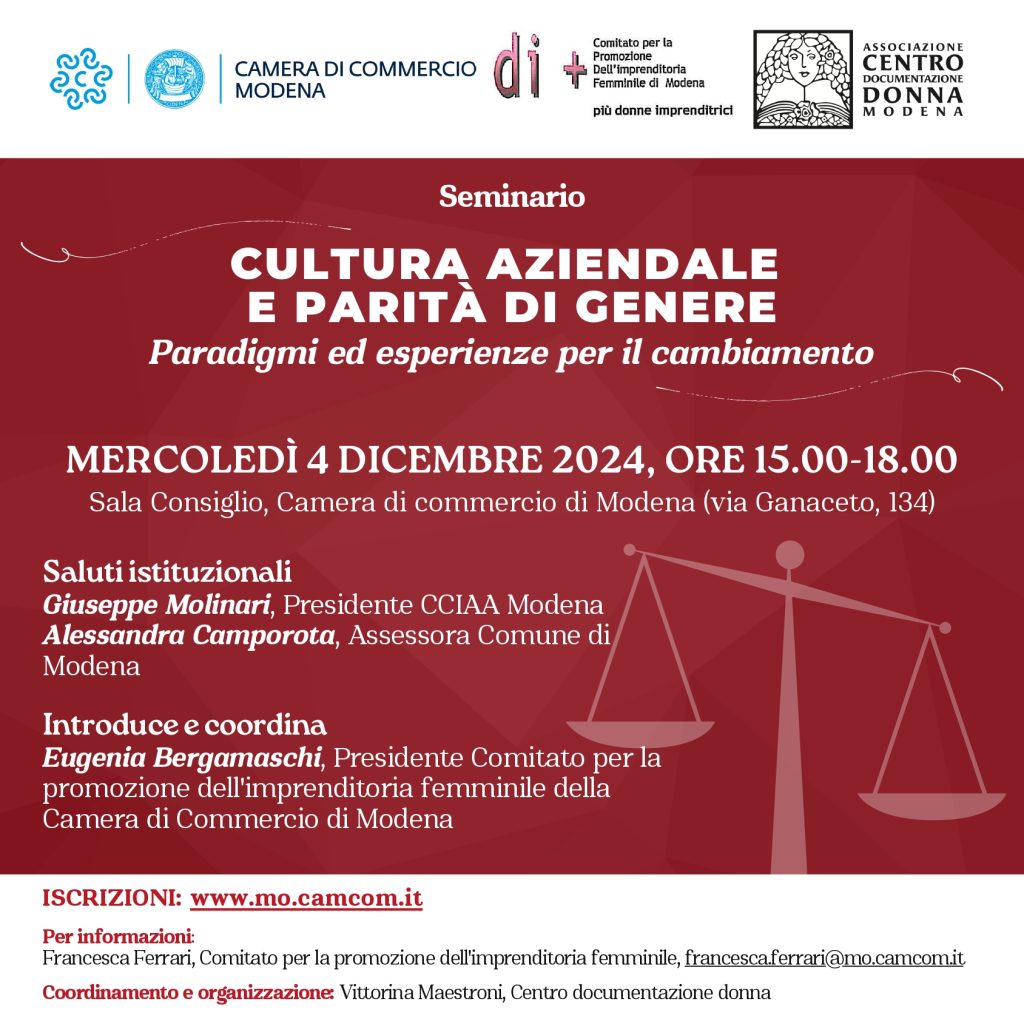 Mercoledì 4 dicembre 2024, dalle ore 15.00 alle 18.00, presso la Camera di Commercio di Modena si terrà il seminario Cultura aziendale e parità di genere. Paradigmi ed esperienze per il cambiamento promosso da Camera di Commercio di Modena, Comitato per la promozione dell’imprenditoria femminile di Modena e Centro documentazione donna 𝐼𝑙 𝑠𝑒𝑚𝑖𝑛𝑎𝑟𝑖𝑜 𝑣𝑢𝑜𝑙𝑒 𝑒𝑠𝑠𝑒𝑟𝑒 𝑢𝑛 𝑚𝑜𝑚𝑒𝑛𝑡𝑜 […]