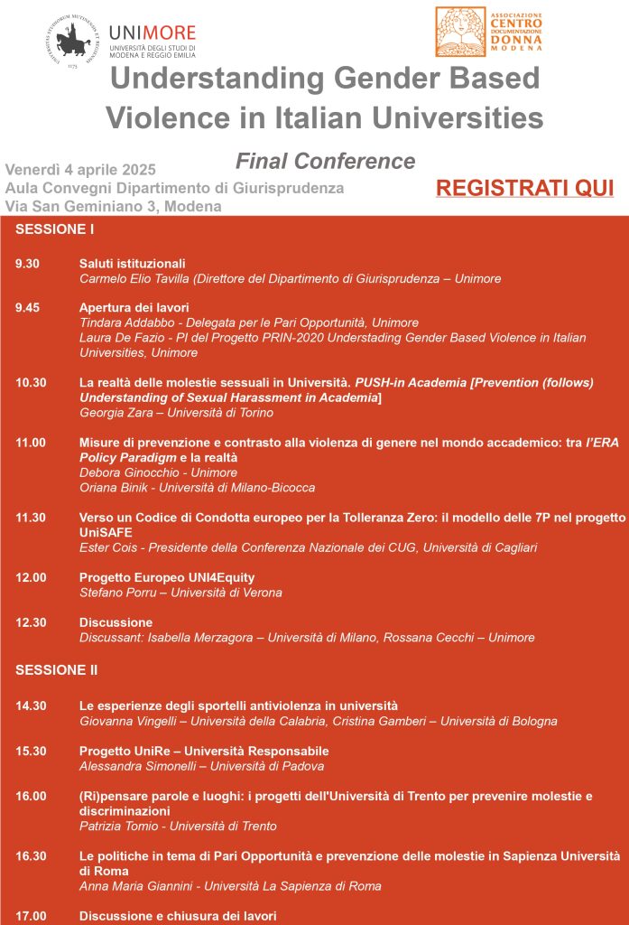 Venerdì 4 aprile 2025 dalle 9.30 presso l’Aula Convegni del Dipartimento di Giurisprudenza si terrà il Convegno di chiusura del Progetto PRIN 2020 “Understanding Gender Based Violence in Italian Universities” promosso dall’Università di Modena e Reggio Emilia (Prof.ssa Laura De Fazio PI; Prof.ssa Tindara Addabbo; Prof.ssa Silvia Ferrari) insieme alle Università di Milano, Torino e La […]