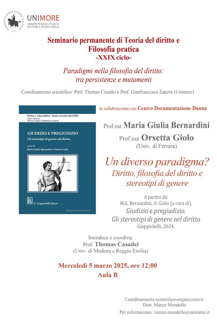 Mercoledì 5 marzo 2025 alle ore 12.00 presso il Dipartimento di Giurisprudenza Unimore (Aula B) si terrà il seminario “Un diverso paradigma? Diritto, filosofia del diritto e stereotipi di genere” promosso all’interno del Seminario Permanente di Teoria del Diritto e Filosofia pratica XXIX ciclo- Paradigmi nella filosofia del diritto: tra persistenze e mutamenti e in collaborazione […]