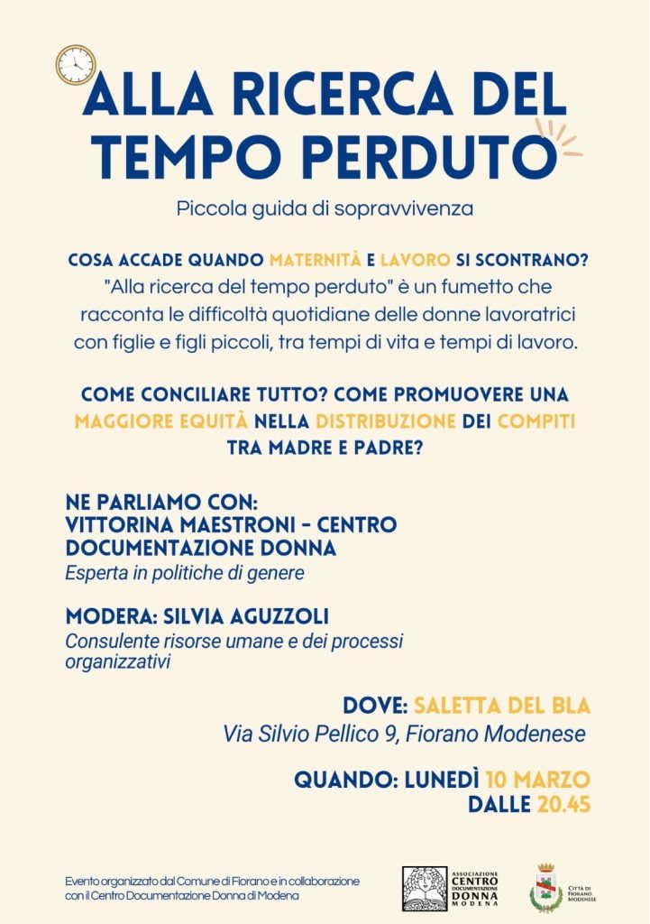 Lunedì 10 marzo 2025 alle ore 20.45 a Fiorano Modenese presso la Saletta del Bla (Via Silvio Pellico 9) si terrà l’incontro “Alla ricerca del tempo perduto. Piccola guida di sopravvivenza” promosso dal Comune di Fiorano modenese in collaborazione con il Centro documentazione donna. Cosa accade quando maternità e lavoro si scontrano? “Alla ricerca del […]