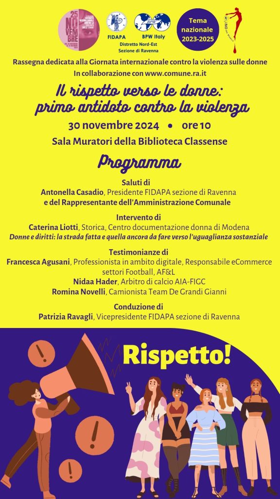 Sabato 30 novembre 2024 alle 10, nella sala Muratori della biblioteca Classense di Ravenna, si terrà la conferenza “Il rispetto verso le donne: primo antidoto contro la violenza” promossa da FIDAPA Ravenna nell’ambito delle iniziative in occasione del 25 novembre del Comune di Ravenna. Interviene: Caterina Liotti del Centro Documentazione Donna di Modena e testimonianze di […]
