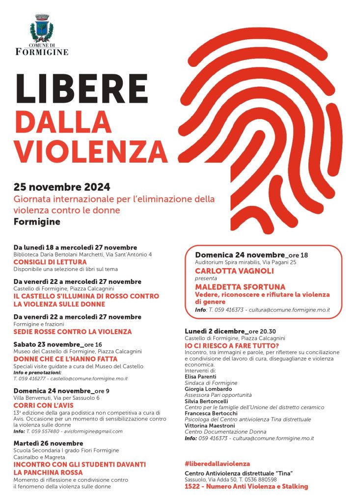 In occasione della Giornata Internazionale per l’eliminazione della violenza contro le donne, Lunedì 25 novembre 2024, alle ore 17,30 presso le panchine rosse del territorio dell’Unione del Sorbara si terrà il reading di brani sul tema del contrasto alla violenza a cura del Centro documentazione donna in collaborazione con Vday Castelfranco Emilia nell’ambito delle iniziative promosse del […]