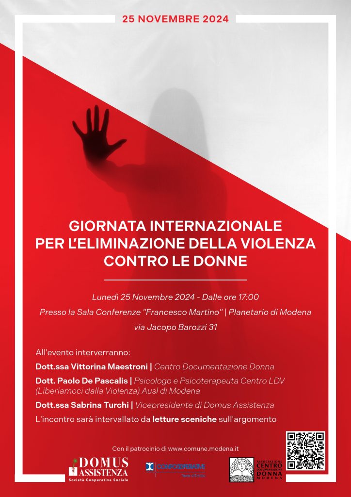 Lunedì 25 Novembre 2024 alle ore 17:00 presso la Sala Conferenze “Francesco Martino” | Planetario di Modena in via Jacopo Barozzi 31 si terrà l’incontro “Domus Assistenza – Giornata contro la violenza sulle donne” promosso da Domus Assistenza Società Cooperativa Sociale in collaborazione con Confcoooperative e Centro documentazione donna e realizzato con il Patrocinio del […]