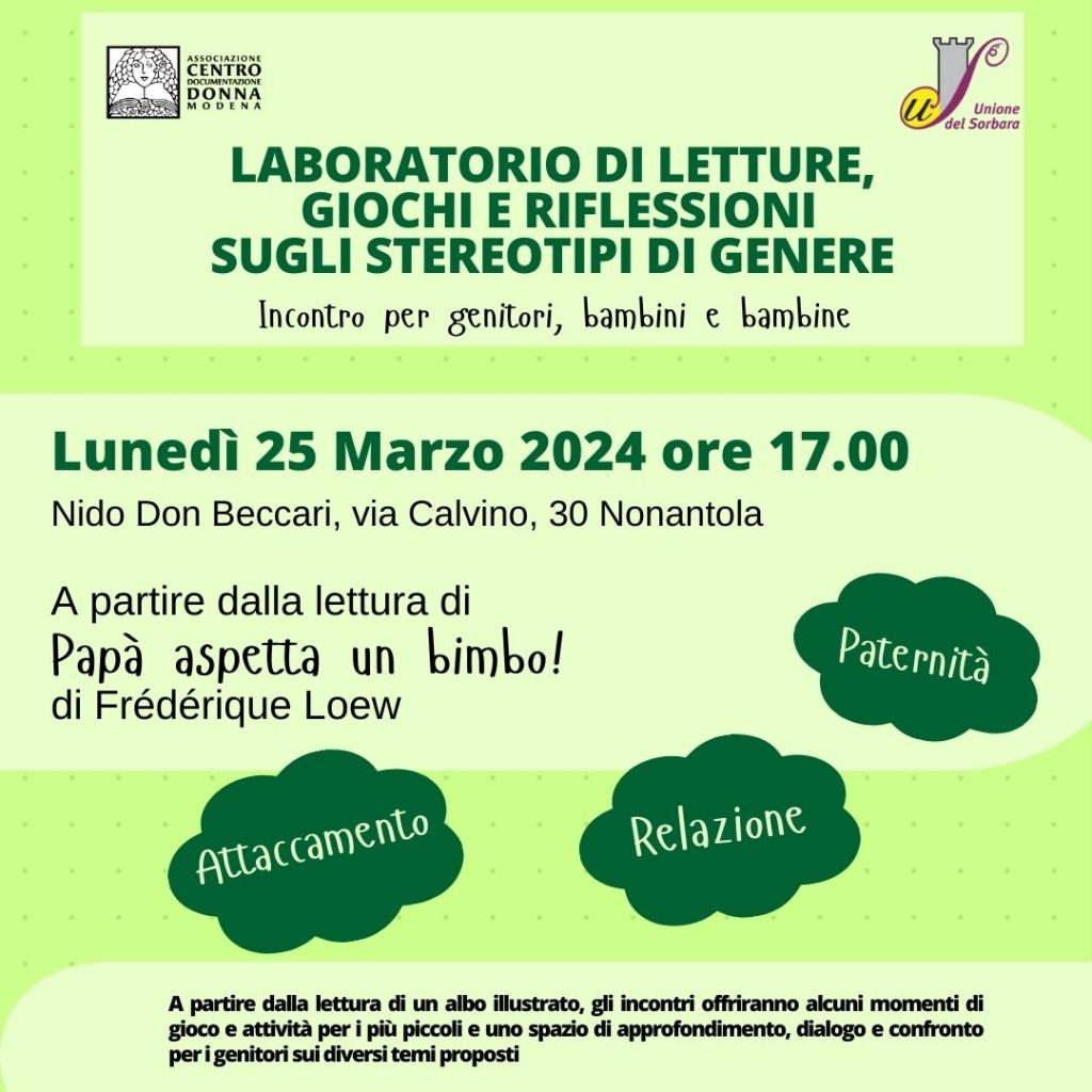 Primo appuntamento del Laboratorio di letture, giochi e riflessioni sugli stereotipi di genere. Incontro per genitori, bambini e bambine promosso da Centro documentazione donna e Unione del Sorbara, lunedì 25 marzo 2024 alle ore 17.00 presso il Nido Don Beccari di Nonantola (Via Calvino, 30) a partire dalla lettura di “Papà aspetta un bimbo!” di […]